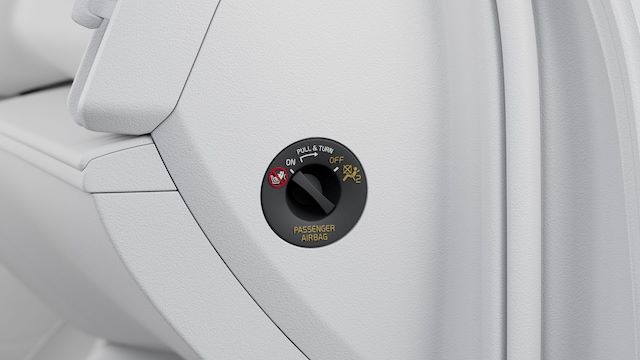 Together with the safety belt, the passenger airbag helps protect the head, face and chest in a frontal collision. It's intelligent too: to optimise protection, the airbag adapts the level of inflation to the force of the impact. And if the impact is so low that the airbag isn't needed, the system will only deploy safety belt pre-tensioners if necessary. To make it possible to mount a child seat in the front passenger seat, the passenger airbag can easily be disconnected using a cut-off switch.